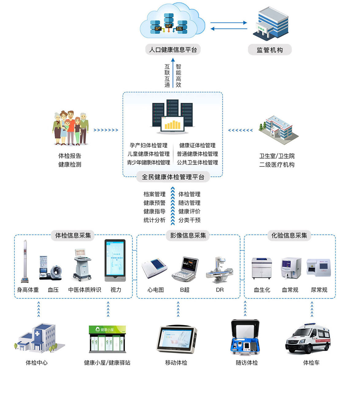普瑞森·區(qū)域全民健康體檢管理平臺以“便民、惠醫(yī)、輔政”為設(shè)計理念,采用云計算、大數(shù)據(jù)、物聯(lián)網(wǎng)、移動互聯(lián)網(wǎng)等信息技術(shù),通過整合全民醫(yī)療健康信息資源,構(gòu)建城市級健康醫(yī)療大數(shù)據(jù)中心,為健康城市打造堅實的數(shù)據(jù)基礎(chǔ)。 平臺實現(xiàn)各橫向業(yè)務(wù)機構(gòu)和縱向管理機構(gòu)信息互聯(lián)互通與業(yè)務(wù)協(xié)同,促進形成有效的分級診療服務(wù)體系,優(yōu)化區(qū)域醫(yī)療資源配置,提高醫(yī)療服務(wù)水平和醫(yī)療質(zhì)量,降低醫(yī)療費用,提升衛(wèi)生綜合管理水平和政府綜合決策能力,給健康城市建設(shè)提供堅實的信息化基礎(chǔ)。