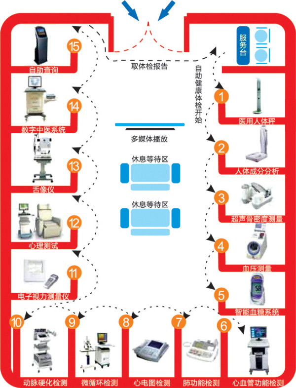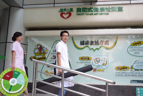 自助式健康小屋主要配備心電圖、人體脂肪、血壓、身高體重、骨密度、血糖、肺功能及心血管功能八個檢測項目。全部完成后會打印報告單,同時還有健康知識的宣教。